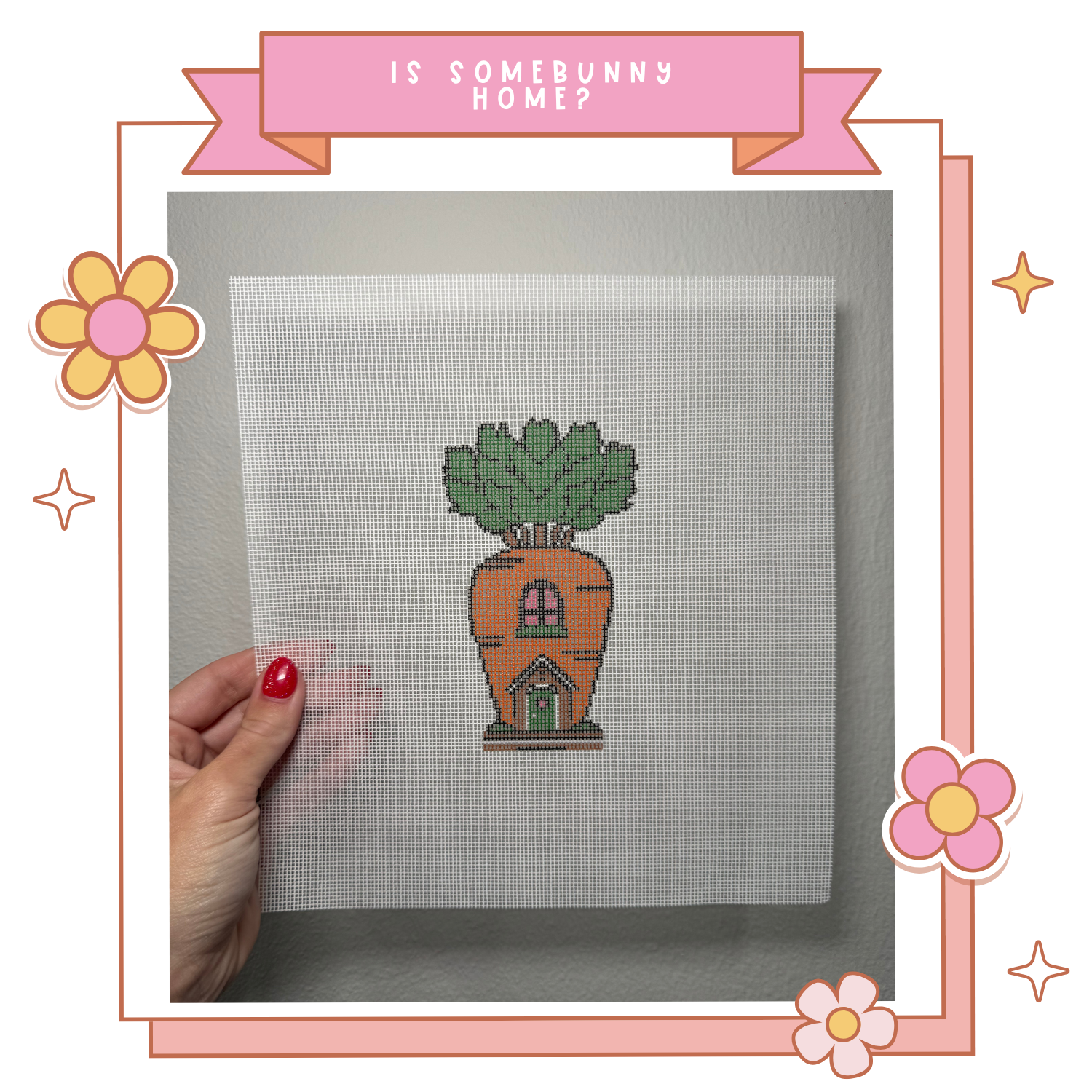 Add a touch of storybook whimsy to your stitching with Is Somebunny Home?, a charming carrot house needlepoint canvas inspired by playful, cozy design. Featuring a sweet carrot-shaped cottage topped with leafy greens, this piece feels straight out of a fairytale garden and is perfect for spring stitching, Easter décor, or bunny lovers alike.